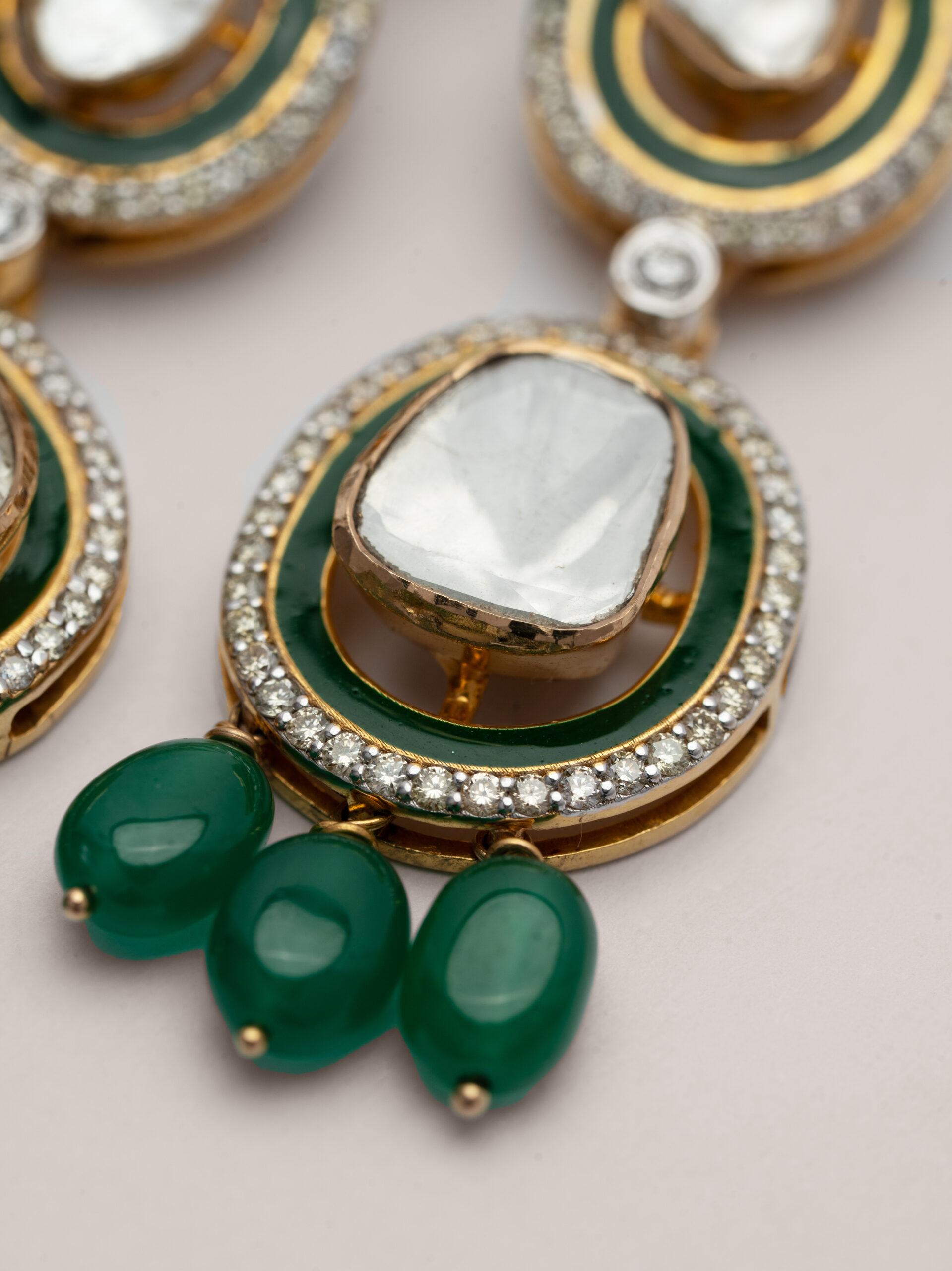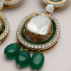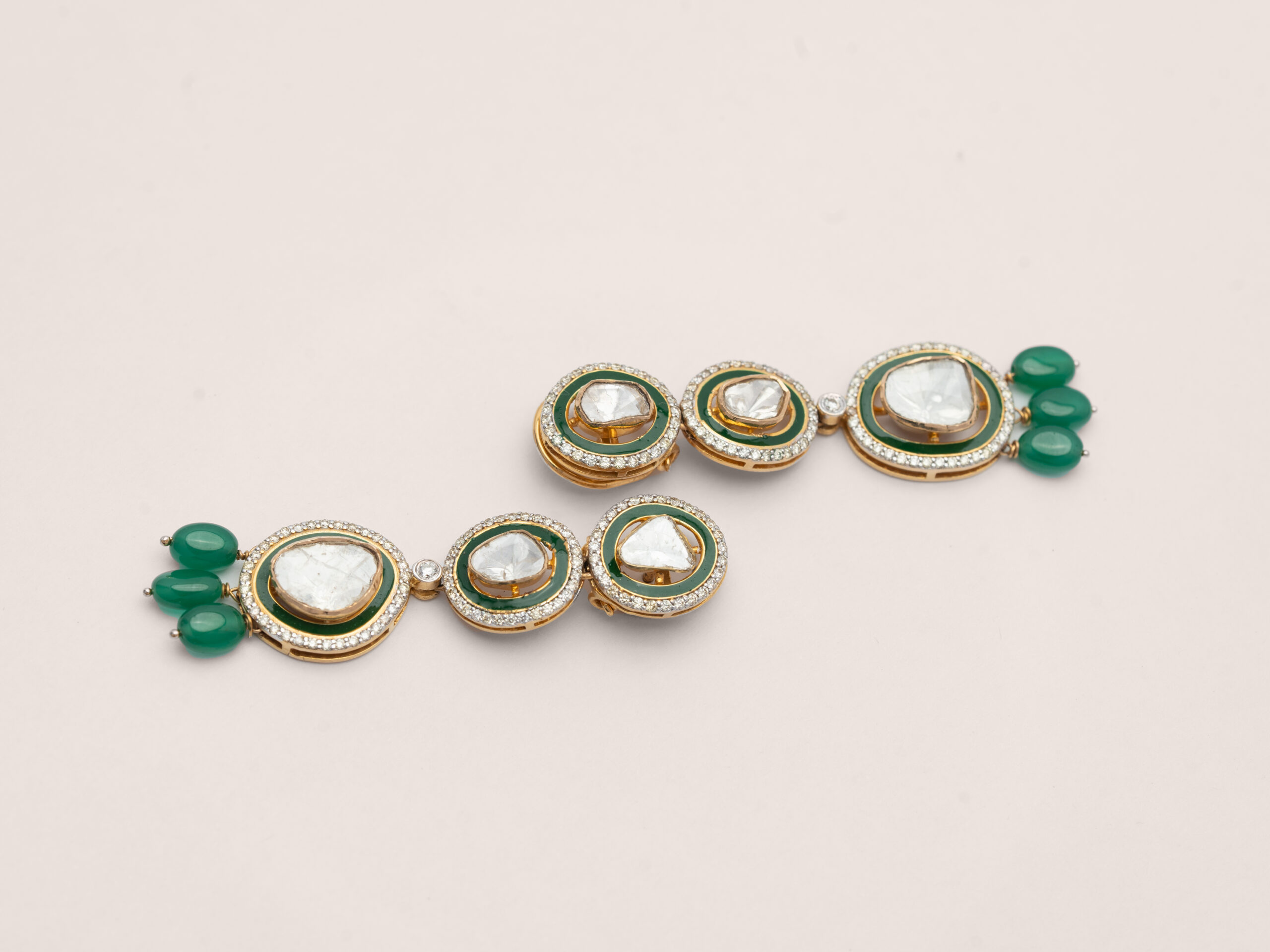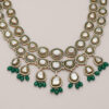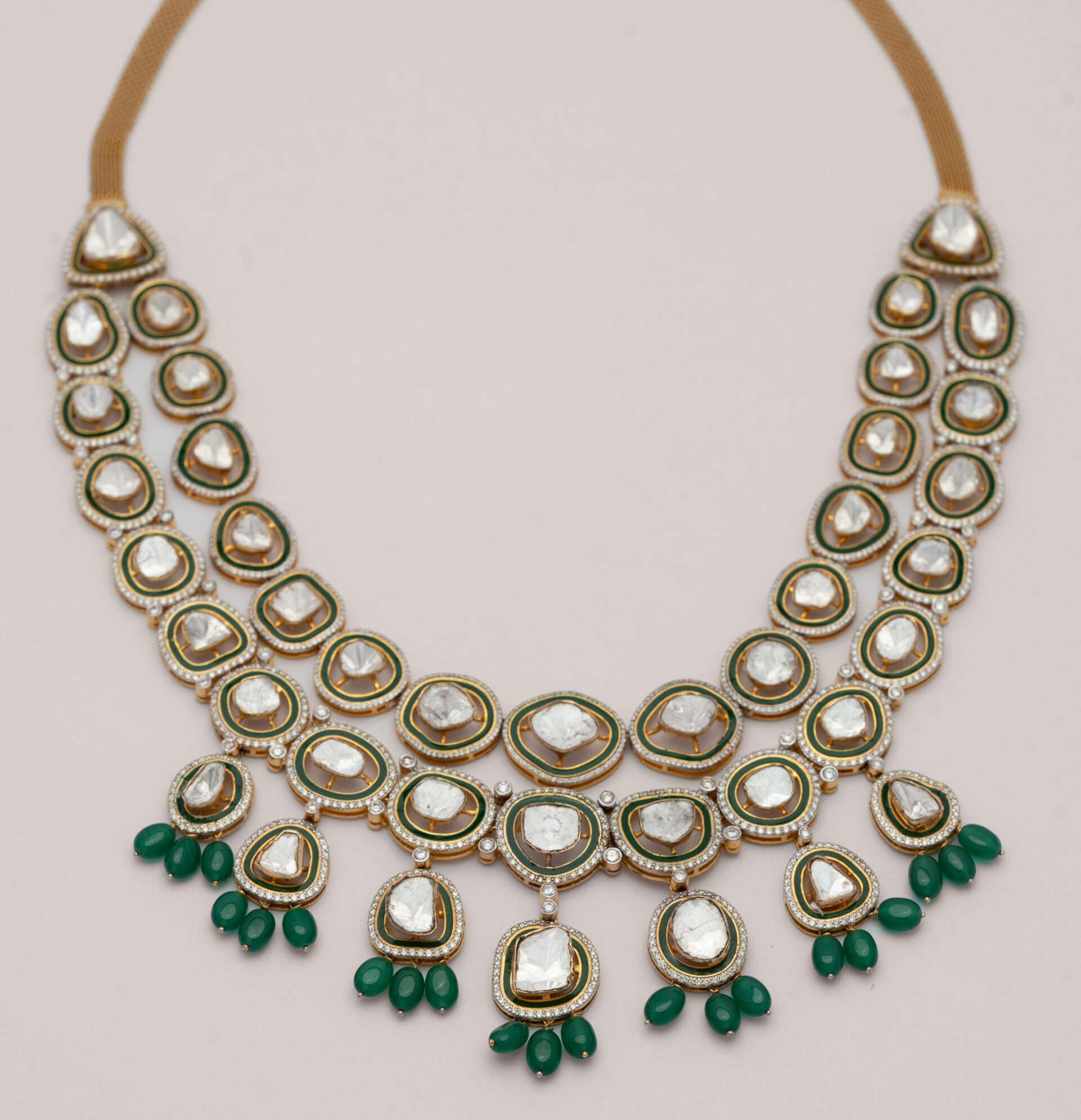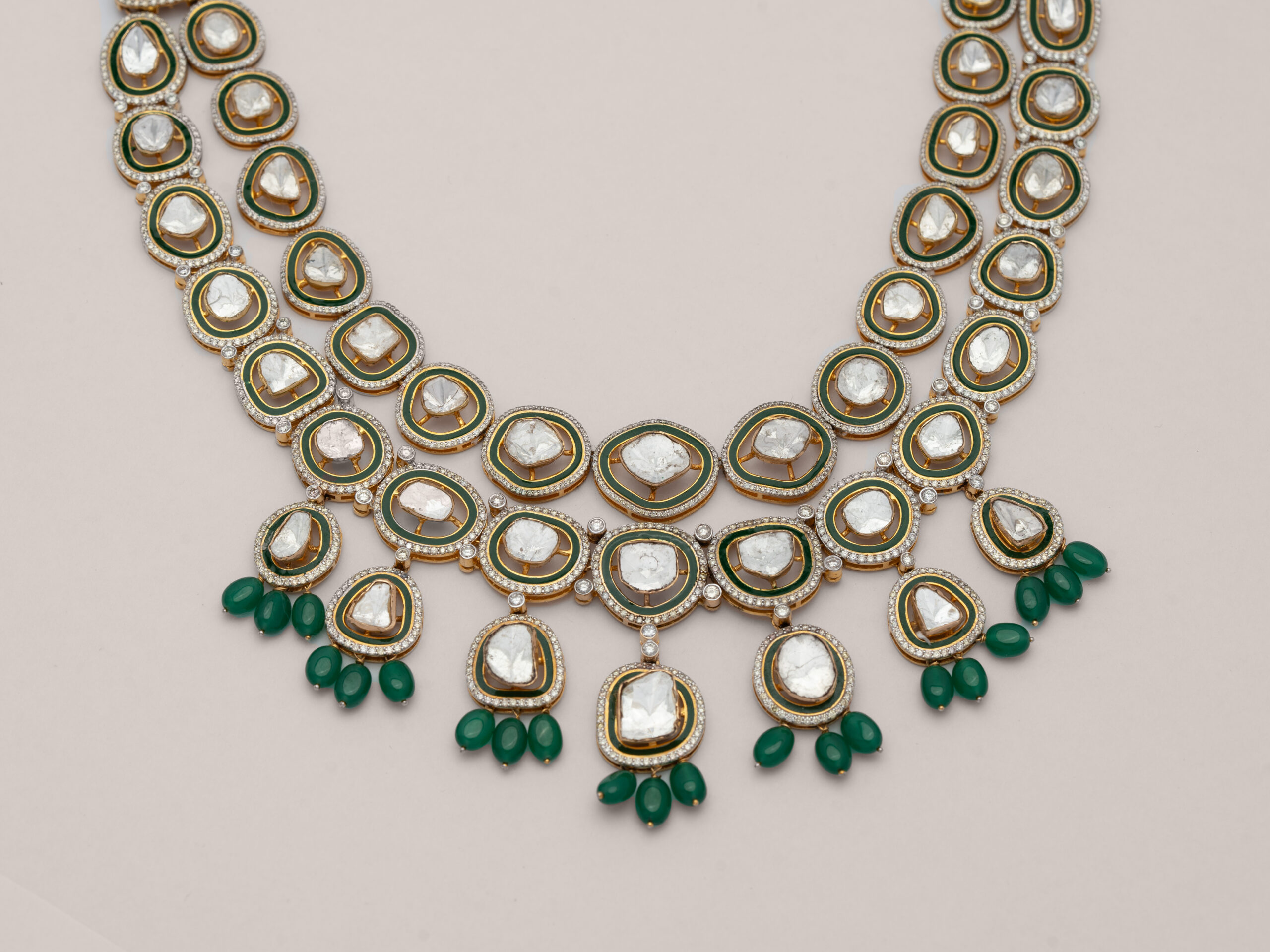 A masterpiece of traditional craftsmanship, this two-tiered Polki necklace celebrates the grandeur of heritage. Each uncut natural diamond is hand-set with precision, framed in delicate gold and bordered by diamonds. The rich green drops add a graceful contrast, like nature’s touch on regal beauty.